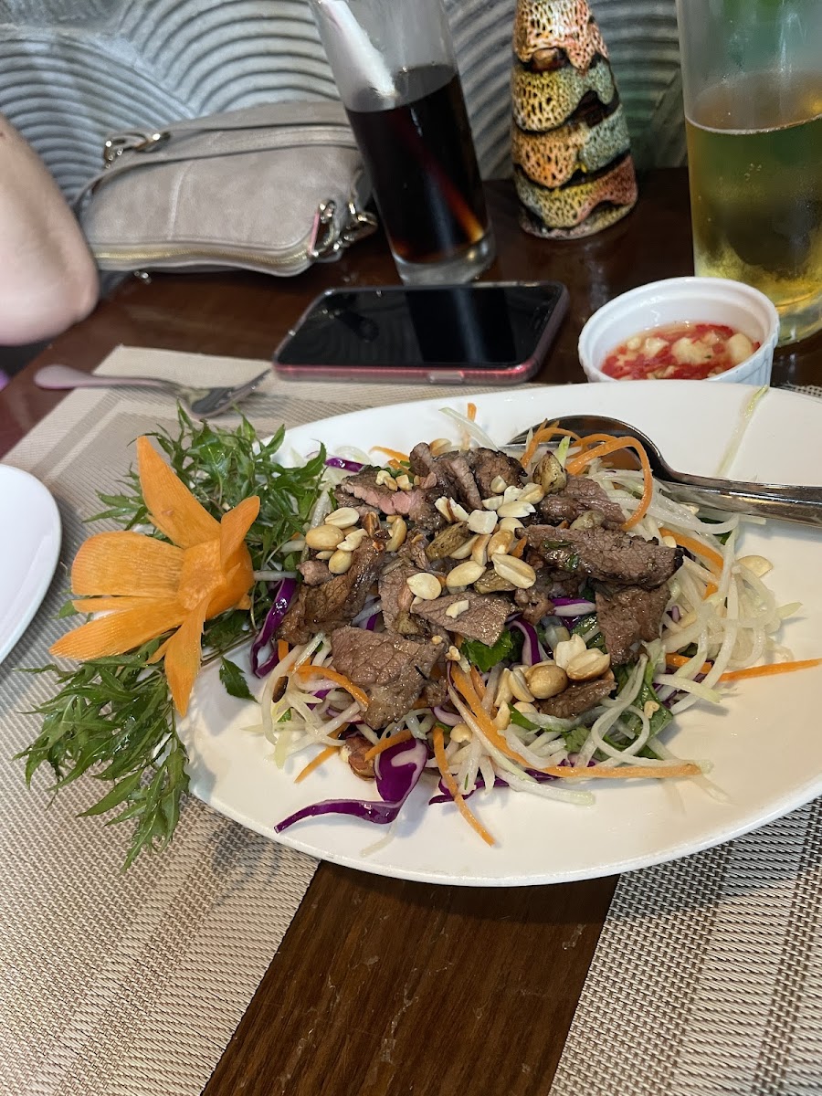 Fantastic family style dinner in the heart of Hanoi. Authentic Vietnamese food and friendly service. Upstairs dining room was super clean and plenty of amazing food. Que Wow: 7 courses: soup, salad, cashew chicken, marinade duck, sticky rice; jumbo shrimp; black rice blueberry yoghurt and Bia Saigon beer.